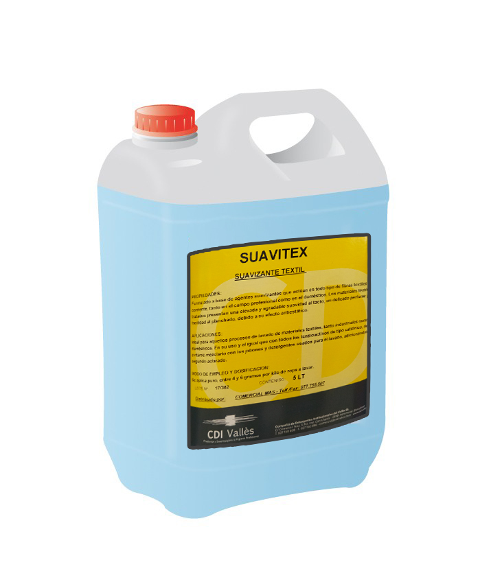 SUAVITEX es un suavizante formulado a base de agentes suavizantes que actúan en todo tipo de fibras textiles de uso corriente, tanto en el campo profesional como en el doméstico. Los materiales textiles tratados presentan una elevada y agradable suavidad al tacto, un delicado perfume y una facilidad al planchado debido a su efecto antiestático.